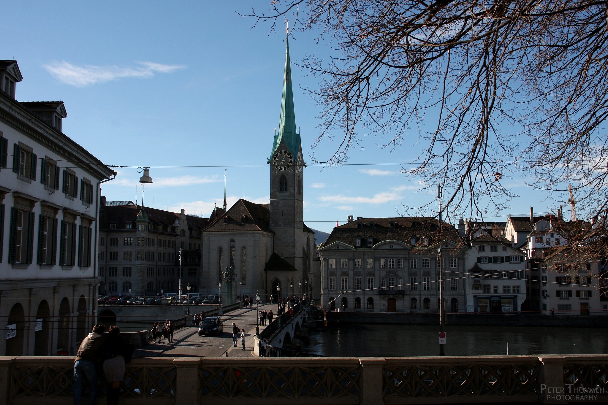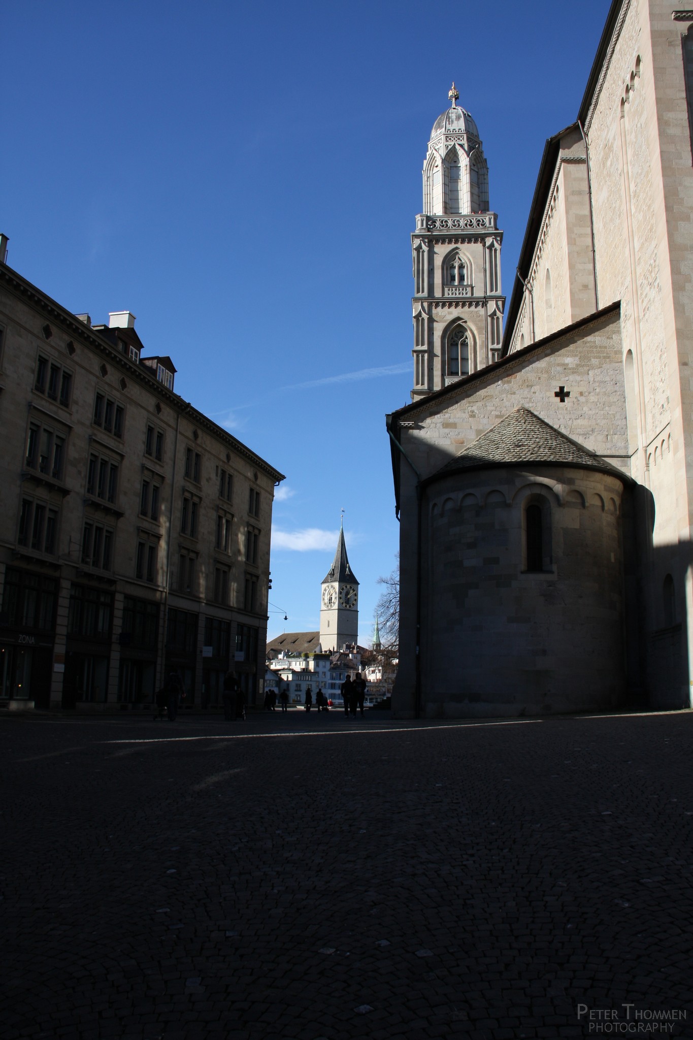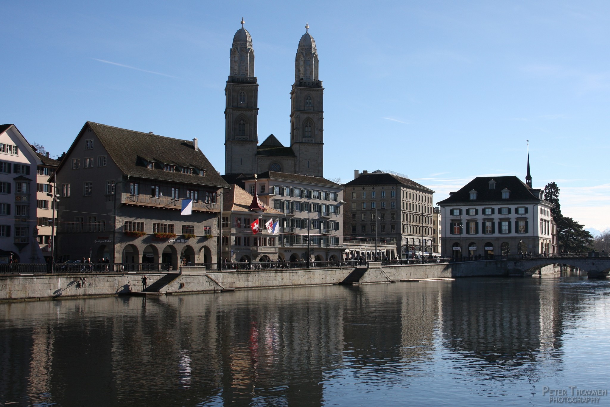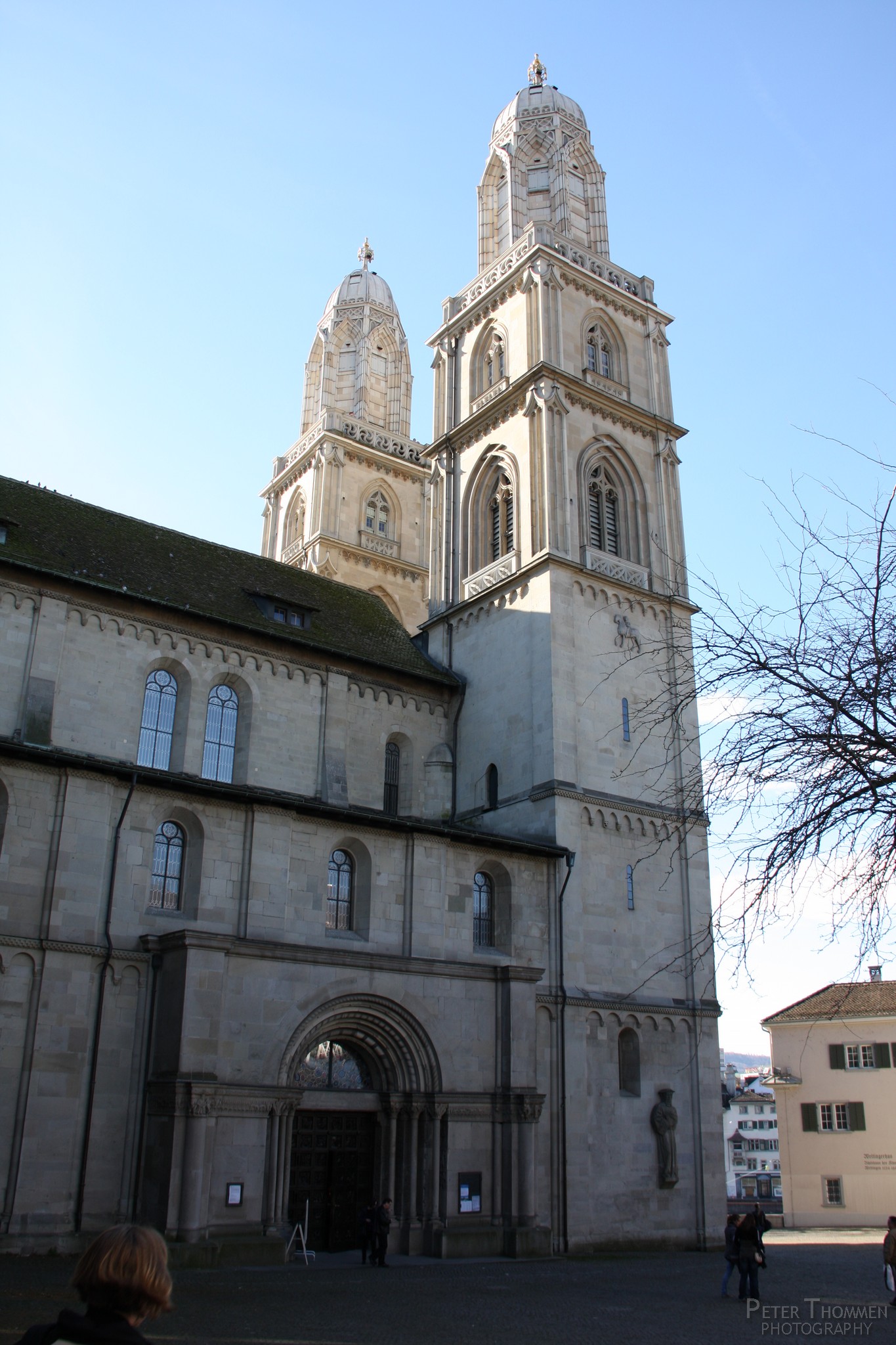 Von der anderen Seite der Limmat hat man einen schönen Ausblick auf die Kirche Grossmünster, mt seinen 2 Türmen.