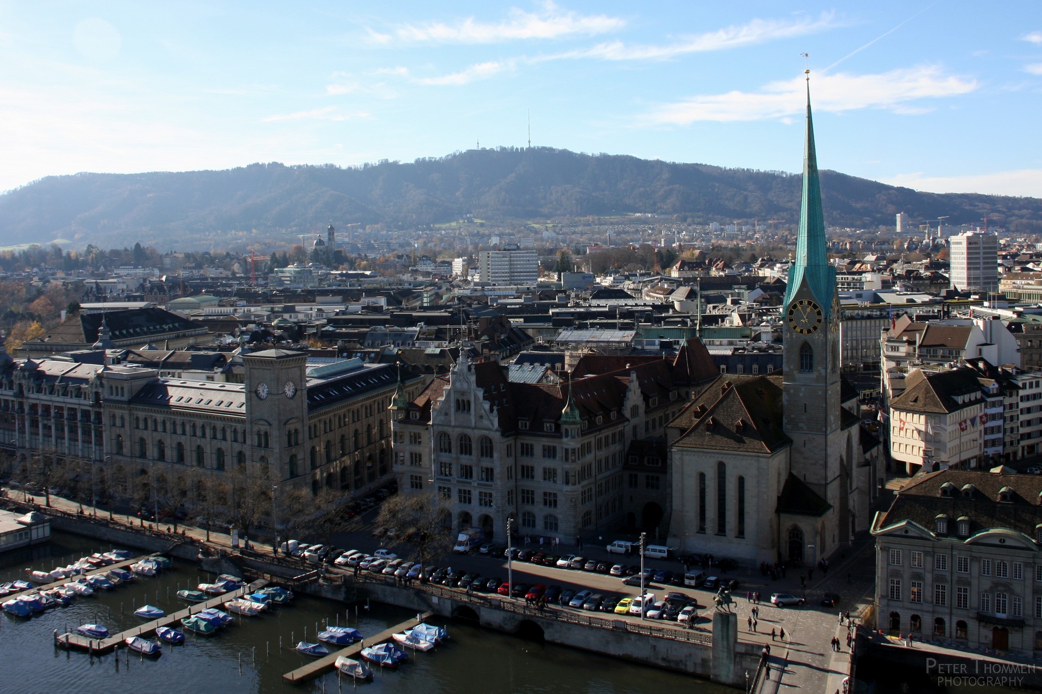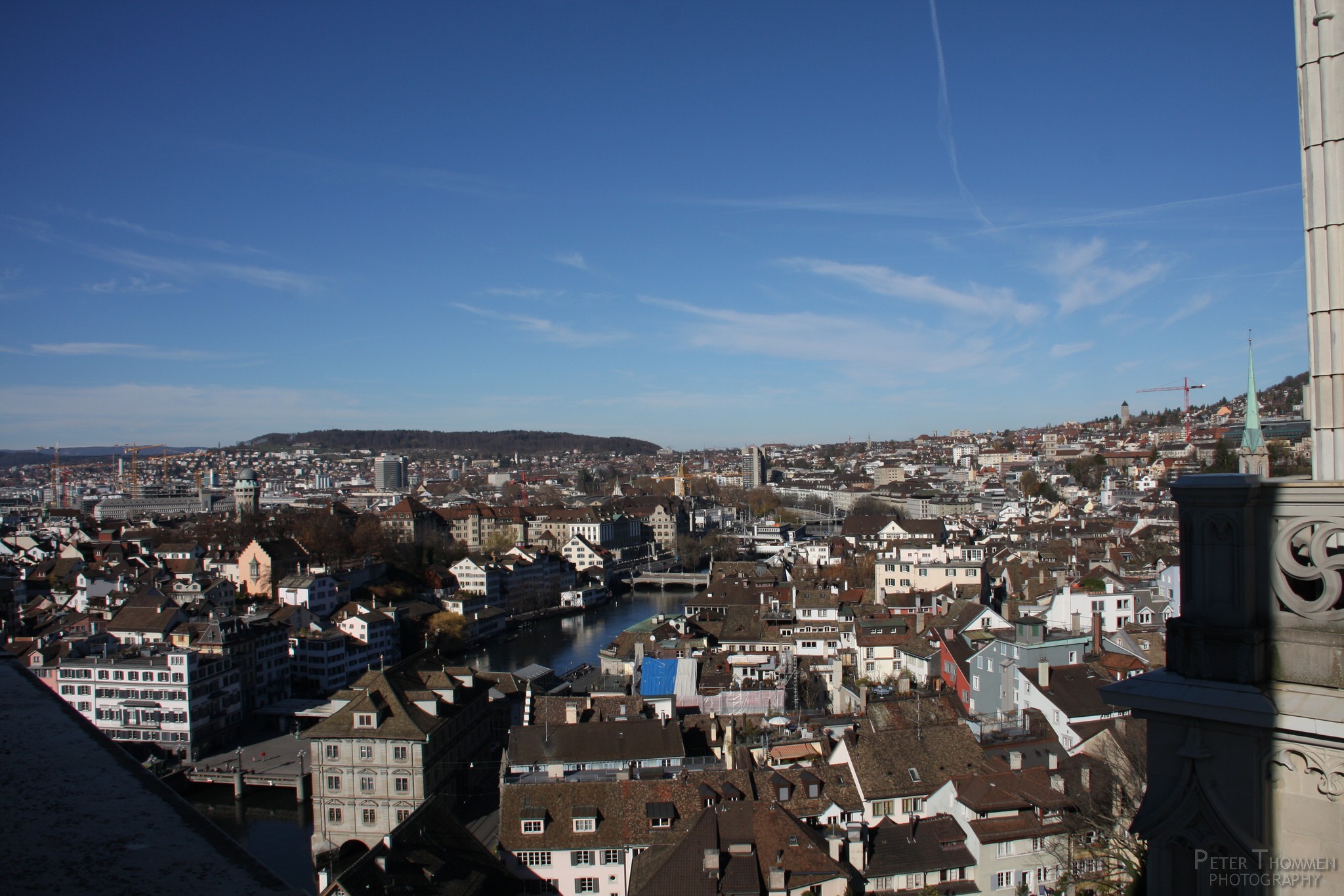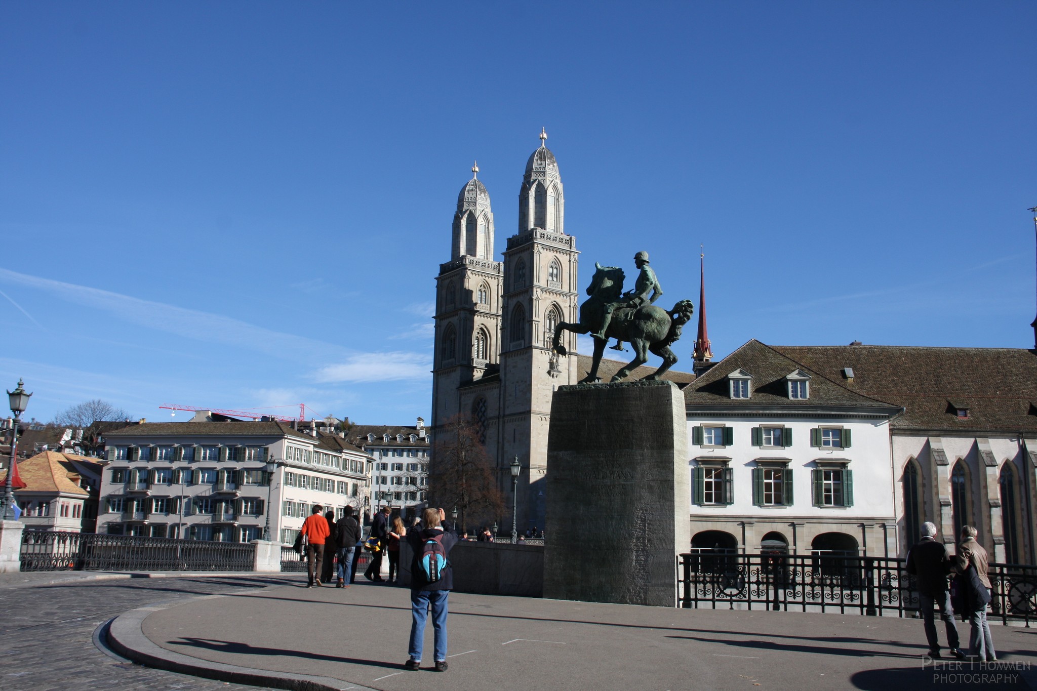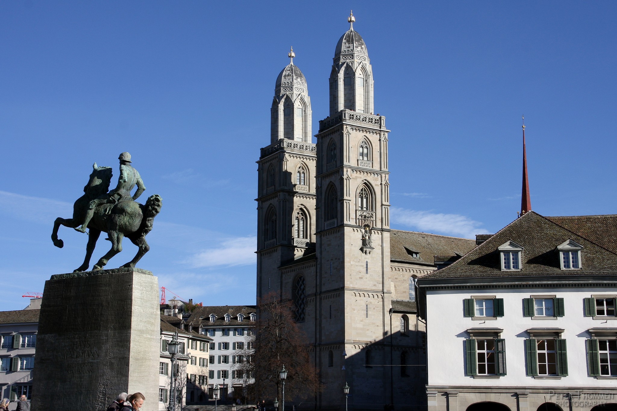 Von der anderen Seite der Limmat hat man einen schönen Ausblick auf die Kirche Grossmünster, mt seinen 2 Türmen.