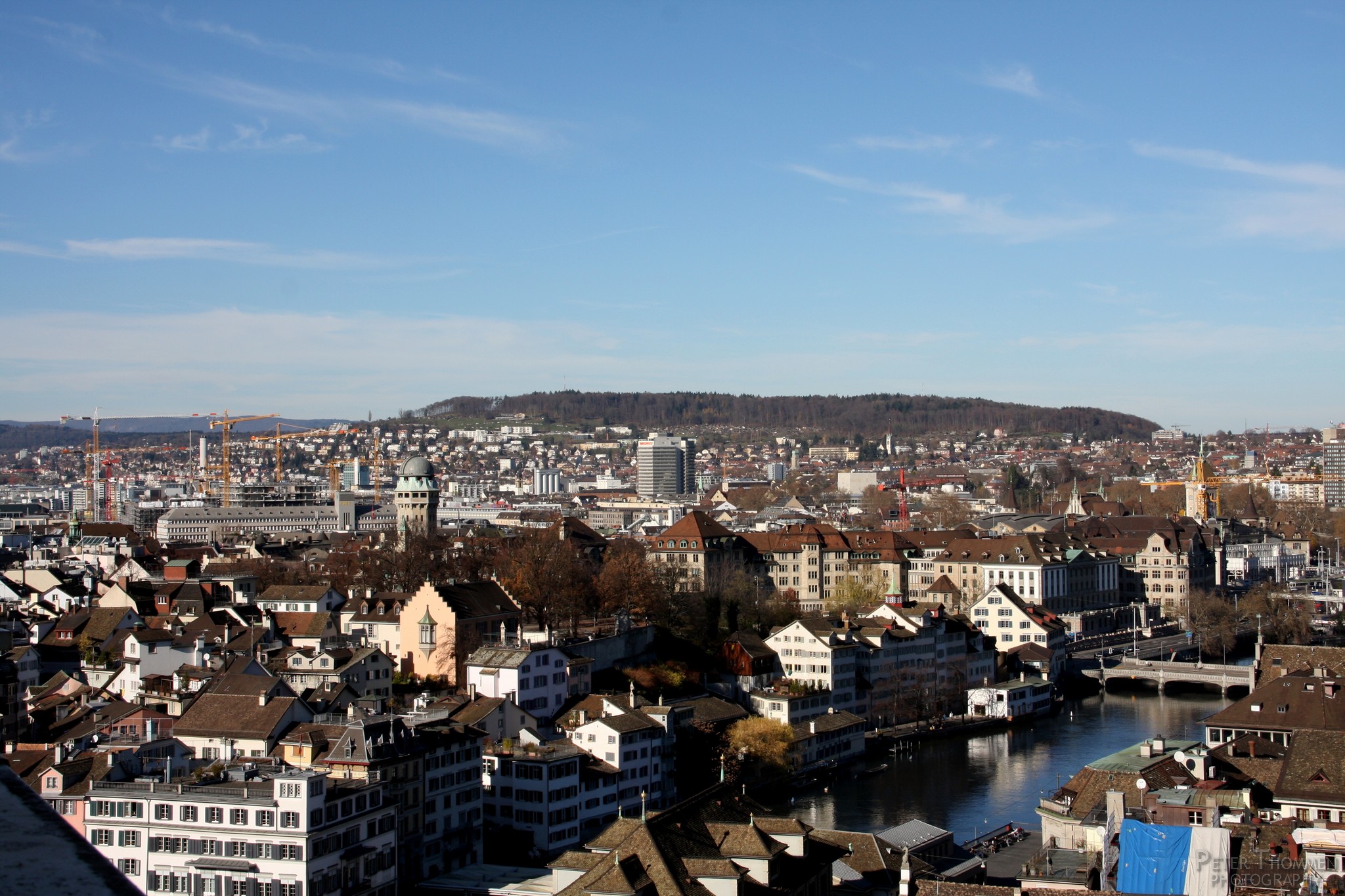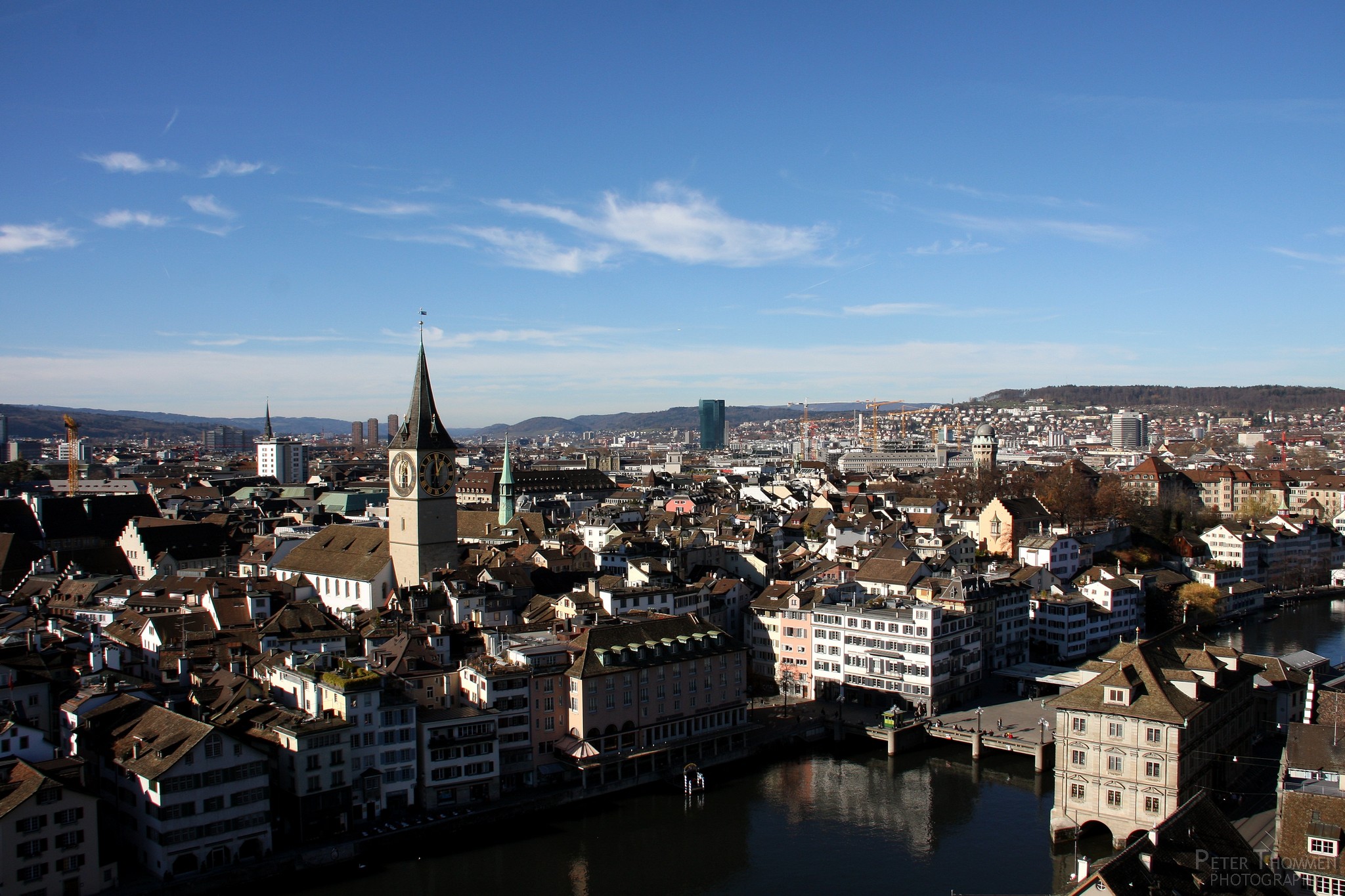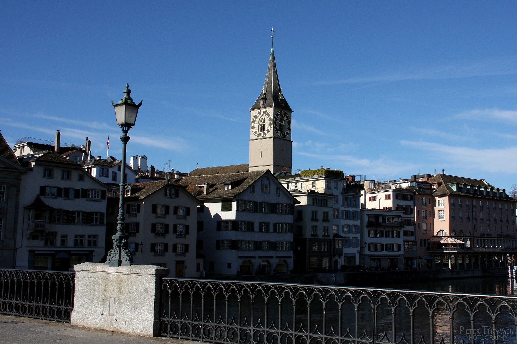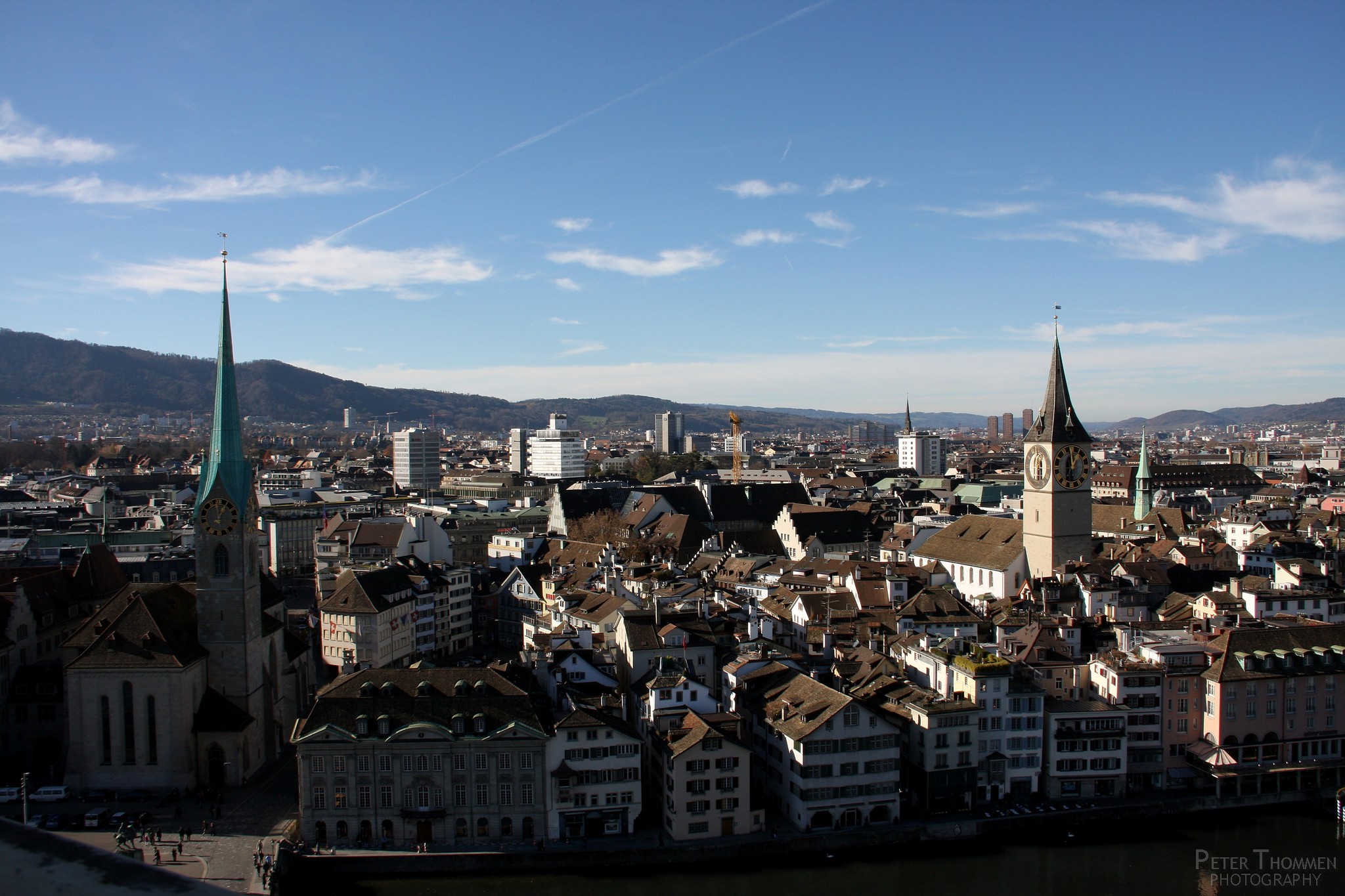 Von der anderen Seite der Limmat hat man einen schönen Ausblick auf die Kirche Grossmünster, mt seinen 2 Türmen.